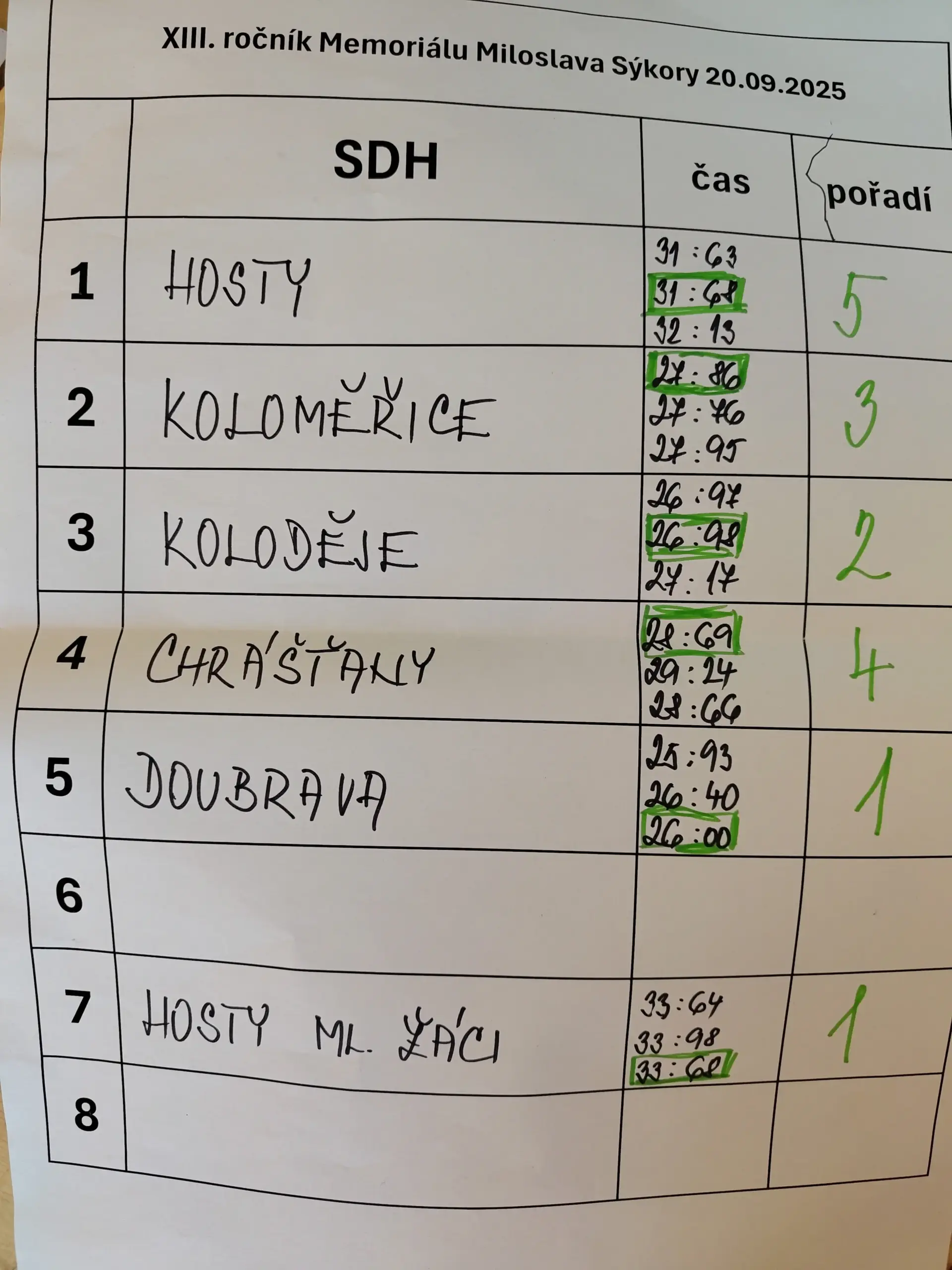 Po několika letech přestávky se podařilo znovu uspořádat memoriál Miloslava Sýkory. Hasičské soutěže se účastnilo celkem šest družstev včetně jednoho dětského. Celou sportovní událost panovalo hezké počasí a pro účastníky bylo připraveno občerstvení včetně vítané novinky v podobě kebabu. Navzdory tomu, že soutěž byla pro družstva po dlouhé době abstinence malou premiérou, všichni předvedli kvalitní a vyrovnané sportovní výkony. Dětský tým z Hostů měl u nás svou absolutní premiéru a svůj pokus za mohutného povzbuzování diváků stihl v čase 33,68s a jako jediný tým ve své kategorii tak vyhrál. Putovní pohár si odvezlo družstvo z Doubravy, zbytek týmů se umístil v následujícím pořadí…